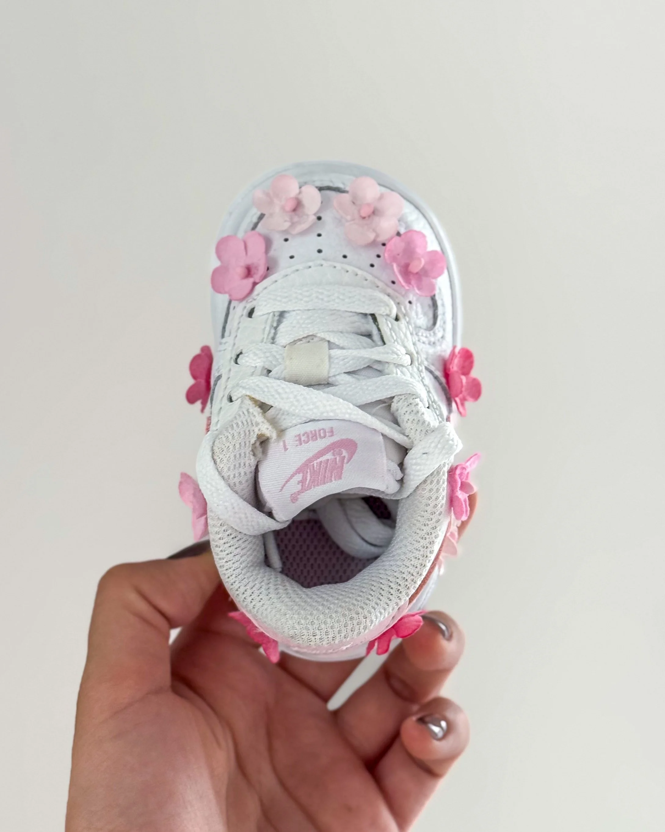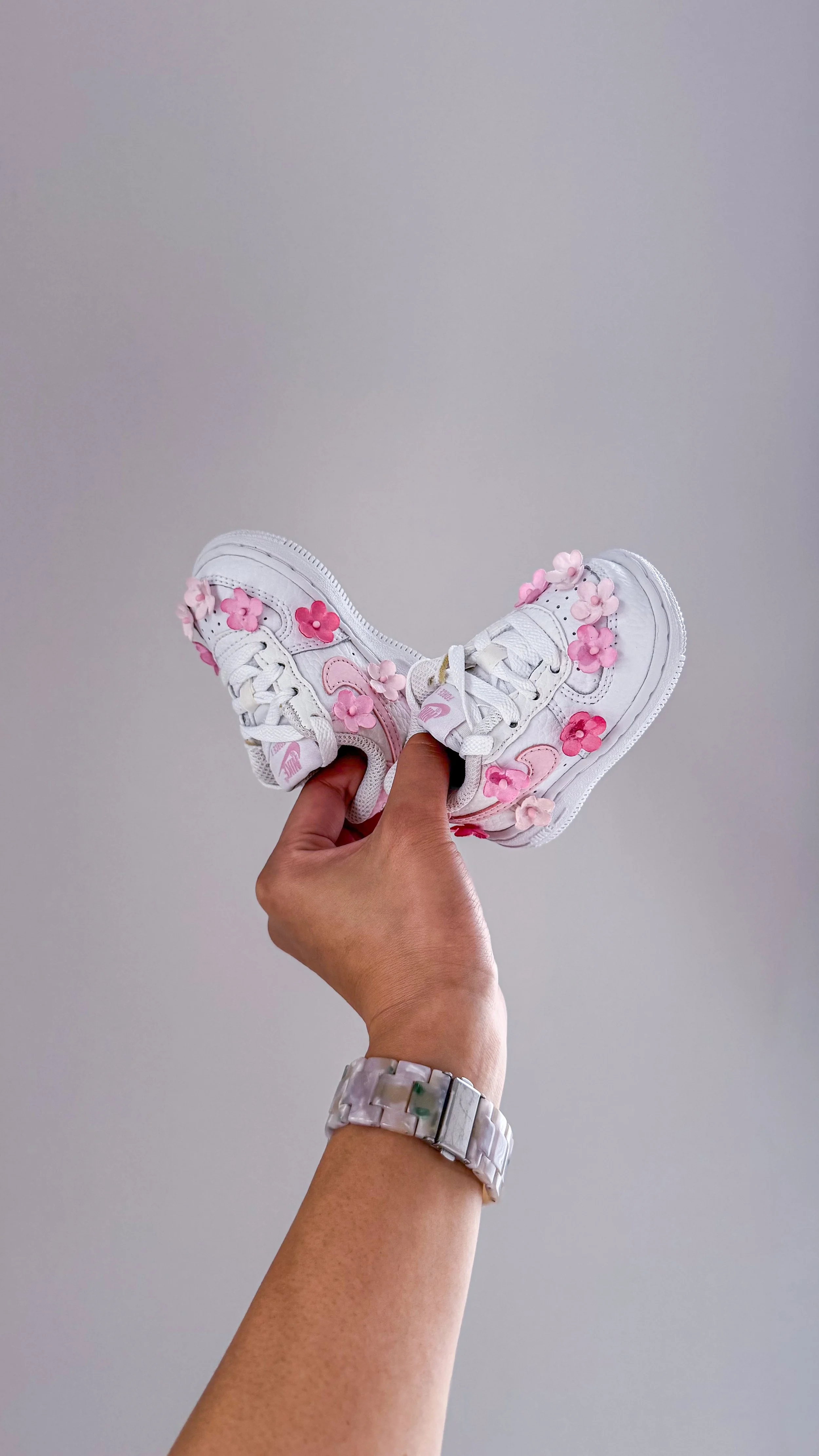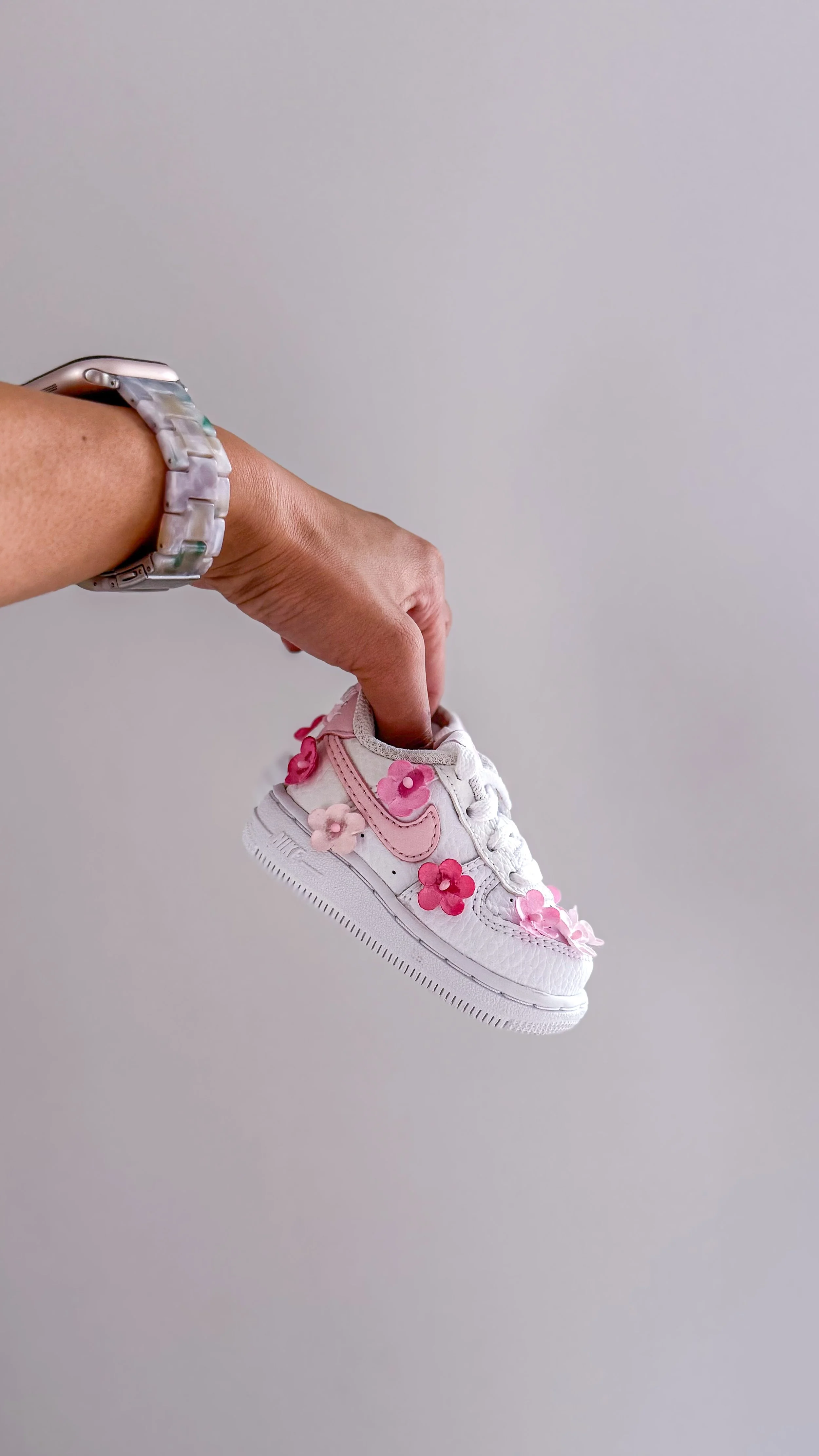 Baby Blooms is a one-of-a-kind pair of custom toddler Nike Air Force 1s crafted exclusively for my goddaughter, Elaina Ledesma. Each sneaker has been transformed into a mini wearable garden, adorned with pink paper flowers that cascade across the white smooth leather in celebration of new life and endless possibilities.