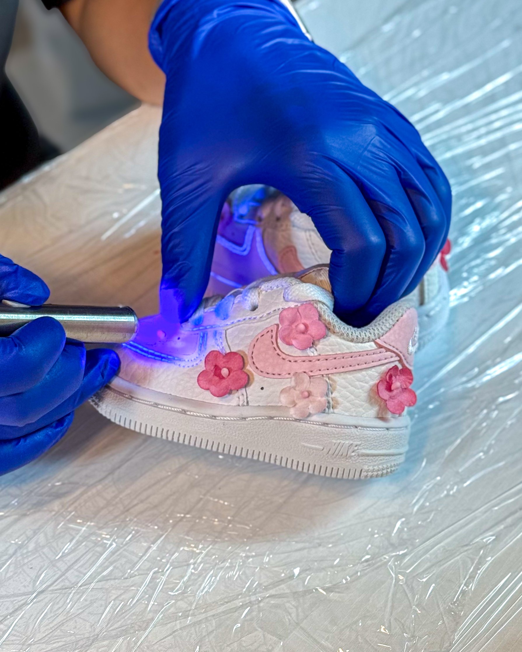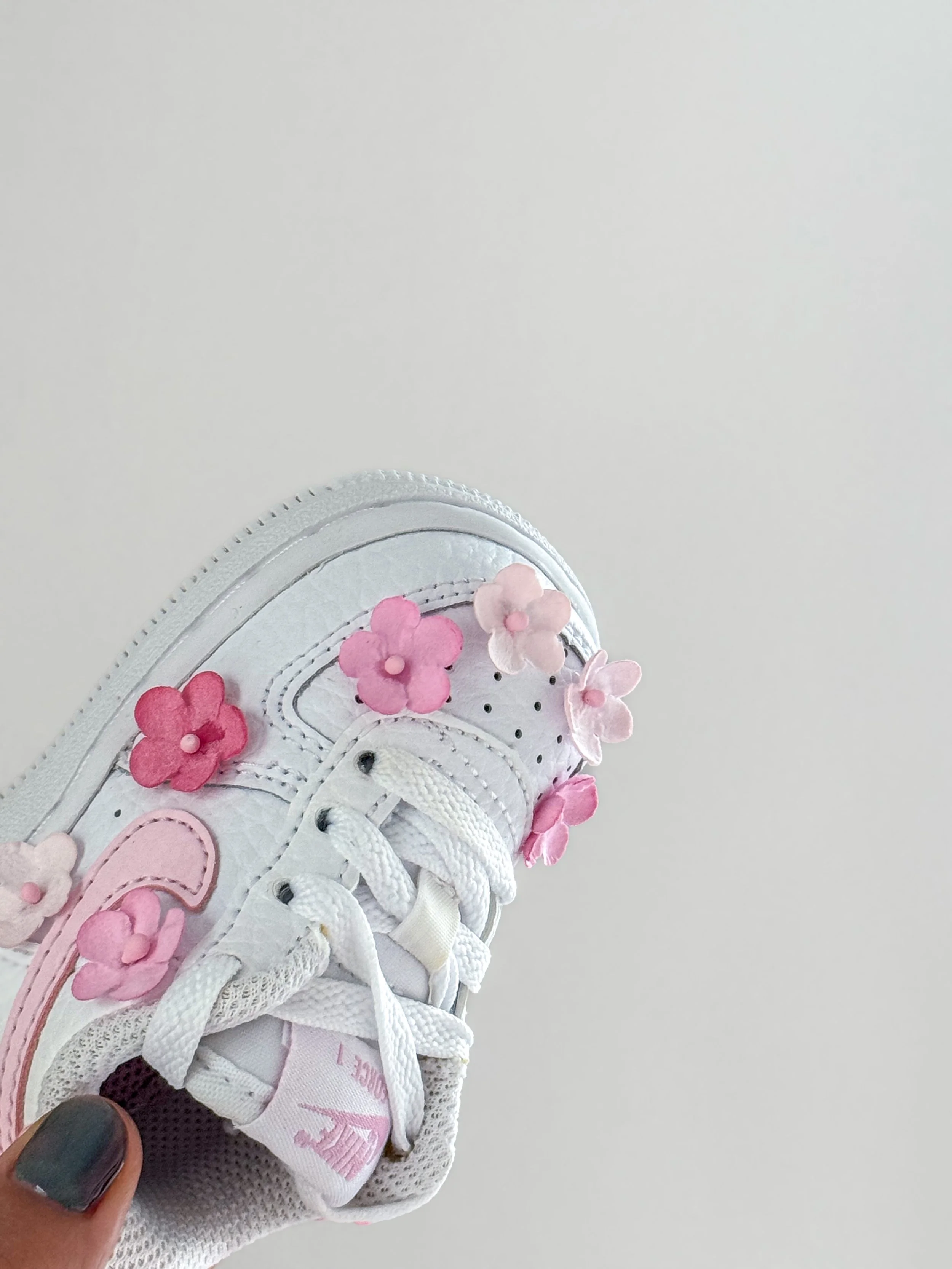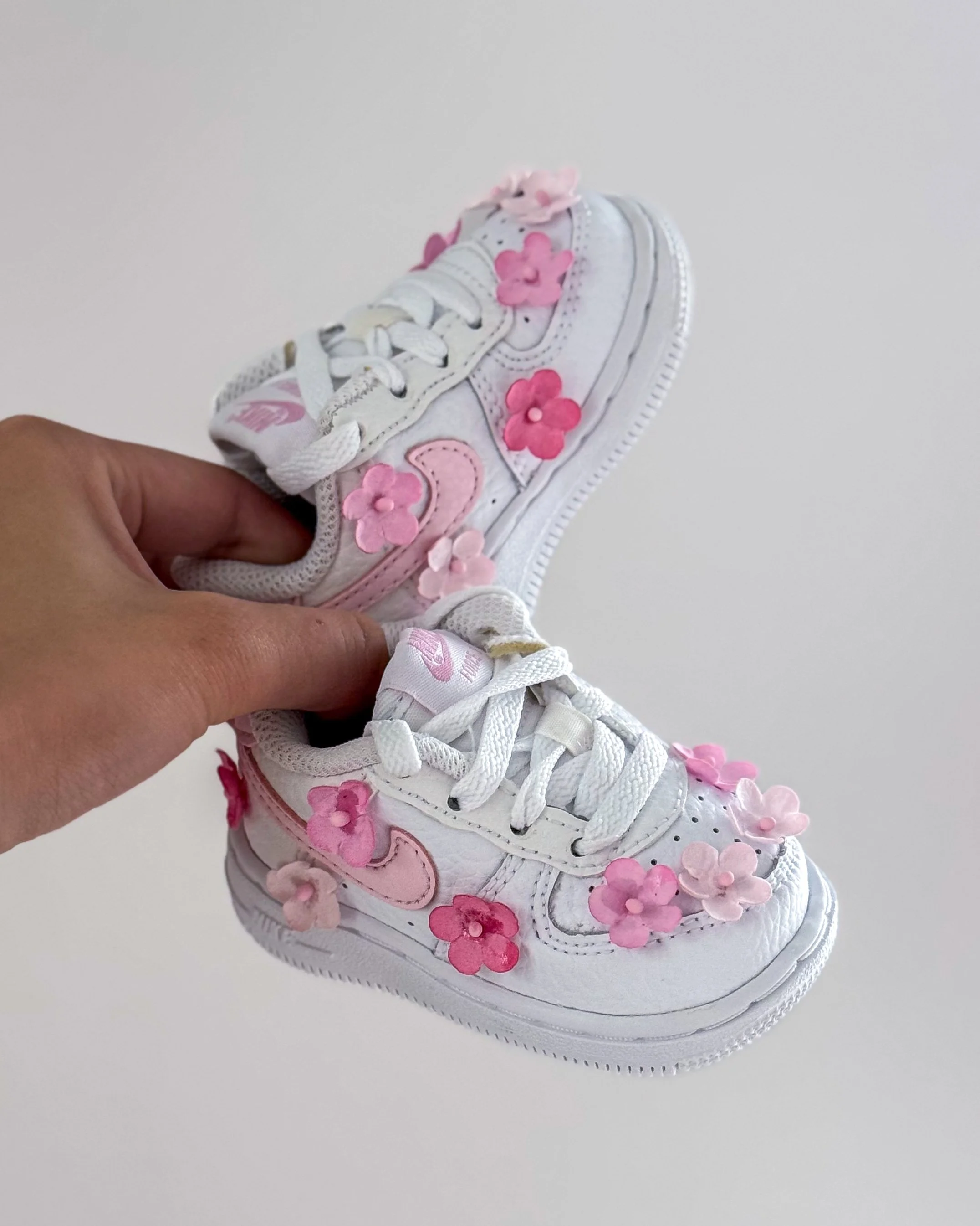 Baby Blooms is a one-of-a-kind pair of custom toddler Nike Air Force 1s crafted exclusively for my goddaughter, Elaina Ledesma. Each sneaker has been transformed into a mini wearable garden, adorned with pink paper flowers that cascade across the white smooth leather in celebration of new life and endless possibilities.